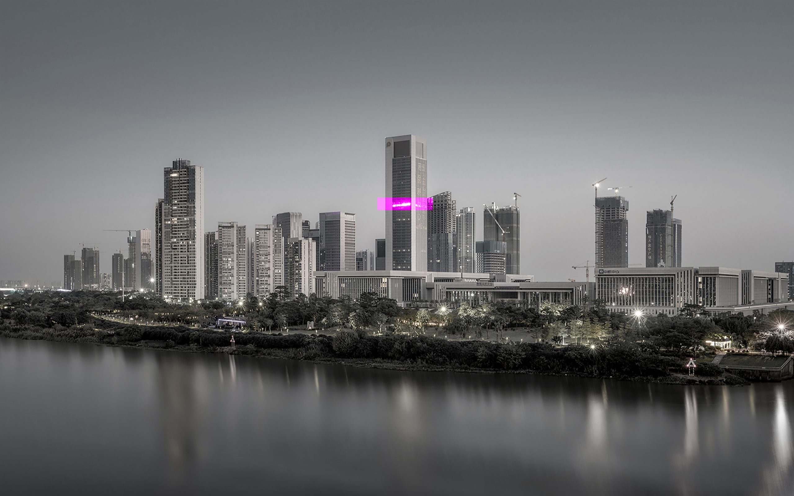 造境:人在空间中连续行走的过程中,视线因空间风景的交织而变得生动有趣, 装置体重组与连接了内在风景与外部城市风景,不同的风景创造了多样空间。 白天,空间像外部光线的过滤器,随光线的明暗变化与内置风景叠加;夜晚,内部人性化反光灯槽的通亮,和外部黑暗中万家灯火景象的叠加,相互渗透让空间变得迷幻,彩色的特色洽谈室也为空间带来愉悦感,各种叠合创造出多样风景的社交场所与品牌空间。